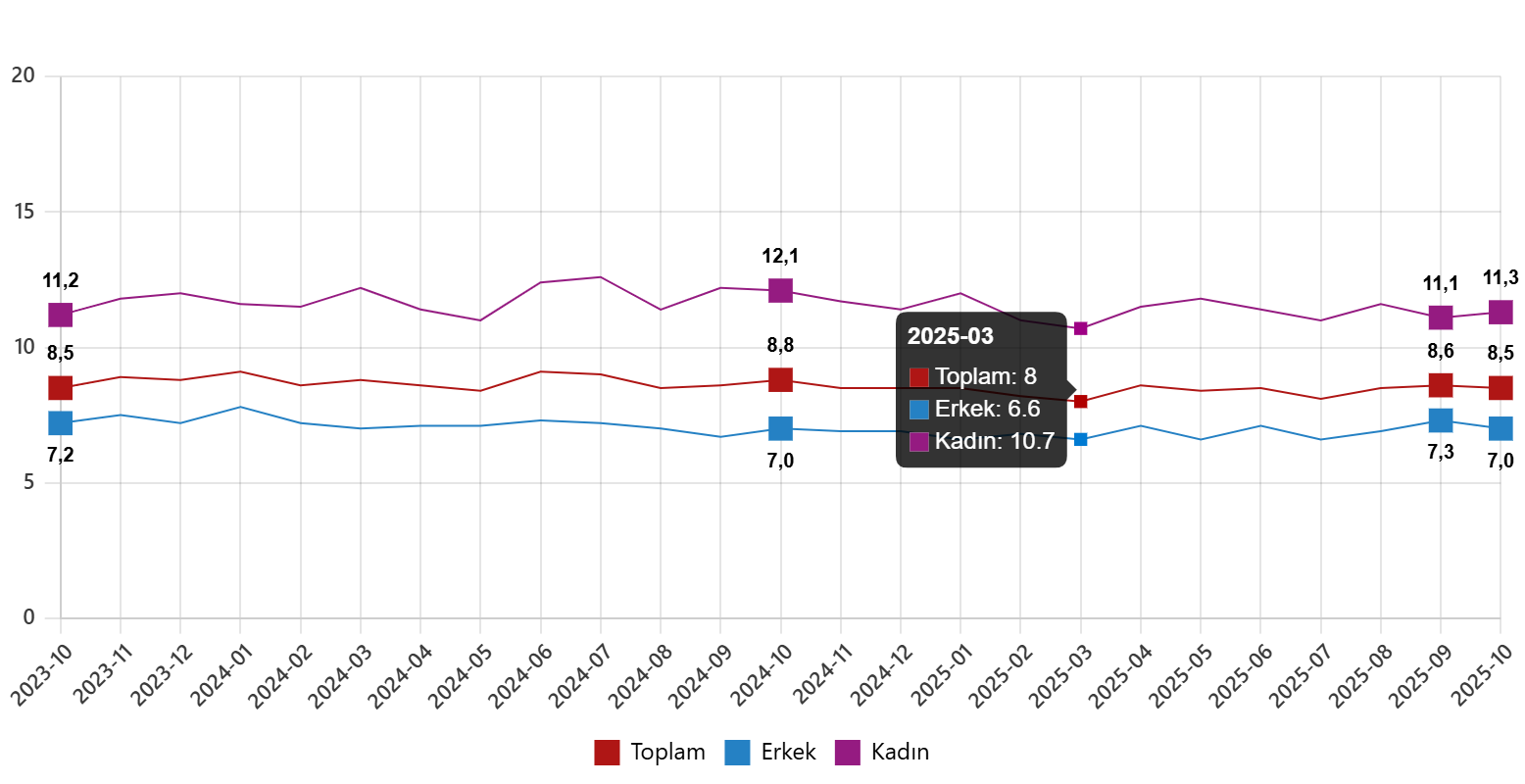 Hanehalkı İşgücü Araştırması sonuçlarına göre; 15 ve daha yukarı yaştaki kişilerde işsiz sayısı 2025 yılı Ekim ayında bir önceki aya göre 27 bin kişi azalarak 3 milyon 33 bin kişi oldu. İşsizlik oranı ise 0,1 puan azalarak %8,5 seviyesinde gerçekleşti. İşsizlik oranı erkeklerde %7,0 iken kadınlarda %11,3 olarak tahmin edildi.