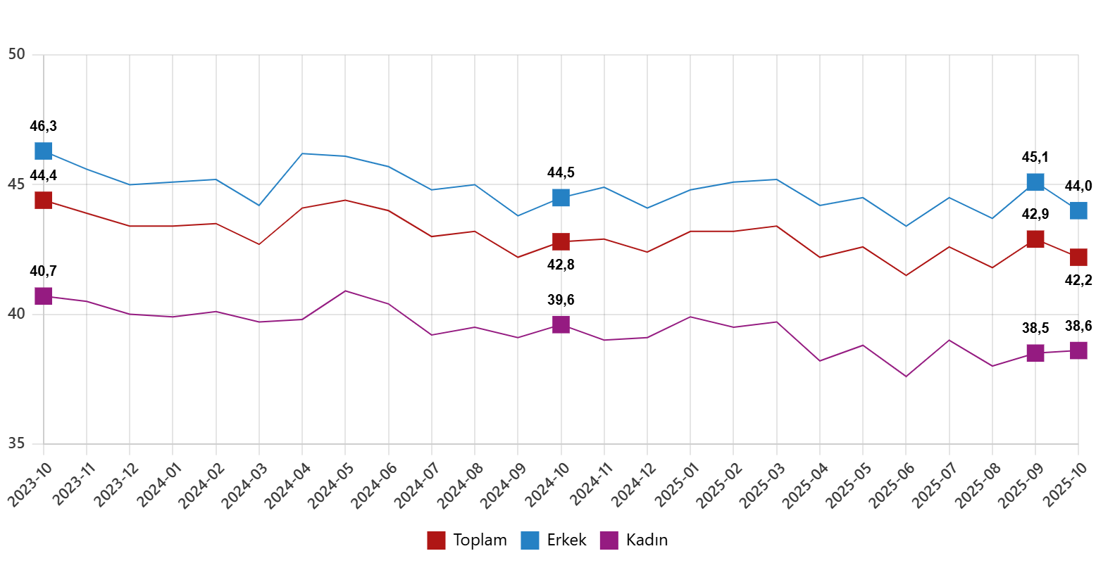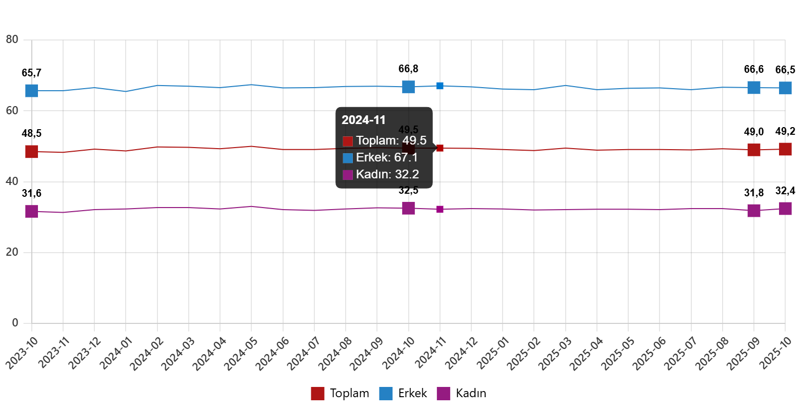 İşgücü, 2025 yılı Ekim ayında bir önceki aya göre 157 bin kişi artarak 35 milyon 804 bin kişi, işgücüne katılma oranı ise 0,2 puan artarak %53,8 olarak gerçekleşti. İşgücüne katılma oranı erkeklerde %71,5 iken kadınlarda %36,5 oldu.