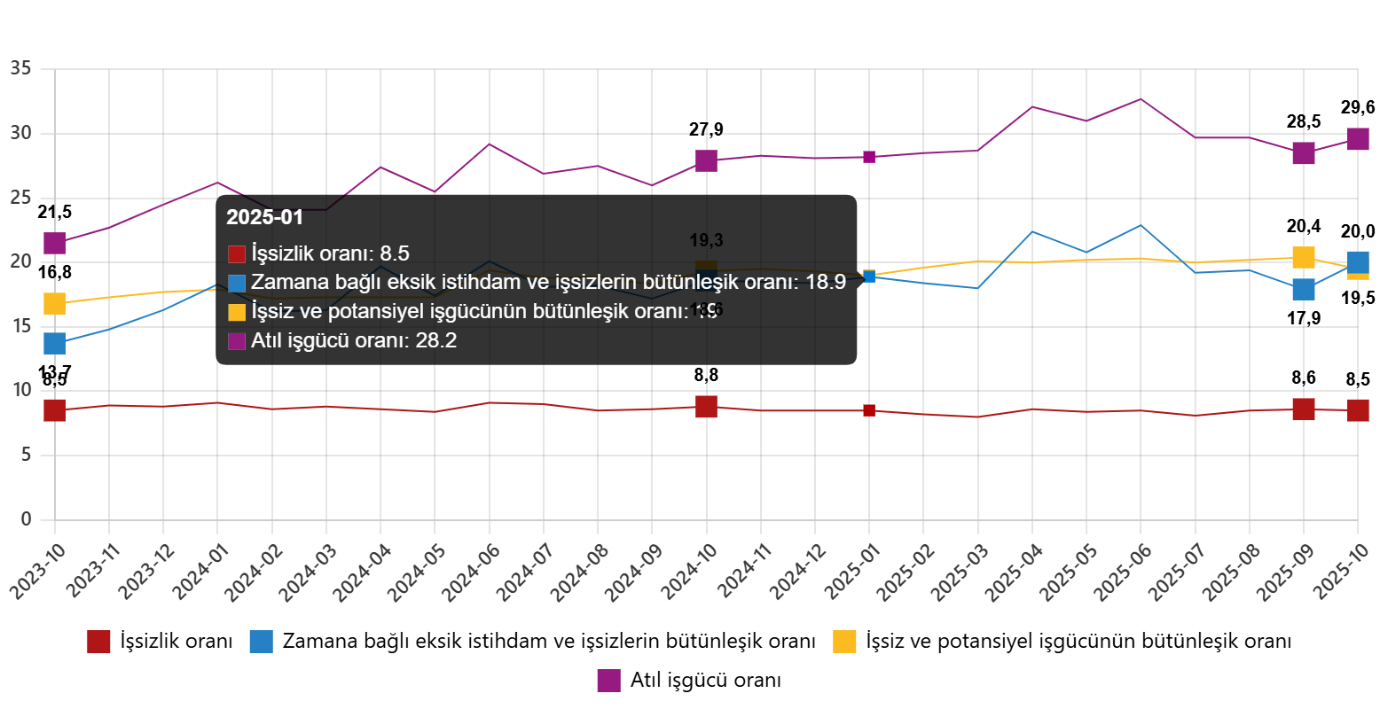 Zamana bağlı eksik istihdam, potansiyel işgücü ve işsizlerden oluşan atıl işgücü oranı 2025 yılı Ekim ayında bir önceki aya göre 1,1 puan artarak %29,6 oldu. Zamana bağlı eksik istihdam ve işsizlerin bütünleşik oranı %20,0 iken işsiz ve potansiyel işgücünün bütünleşik oranı %19,5 olarak tahmin edildi.