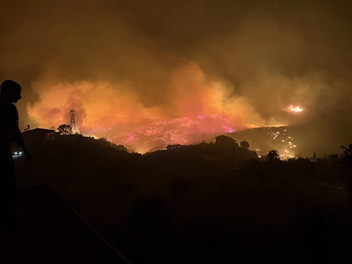 Öte yandan, bölgede bulunan evler ve seralar alevlerin arasında kalırken, tahliye çalışmaları da devam ediyor.